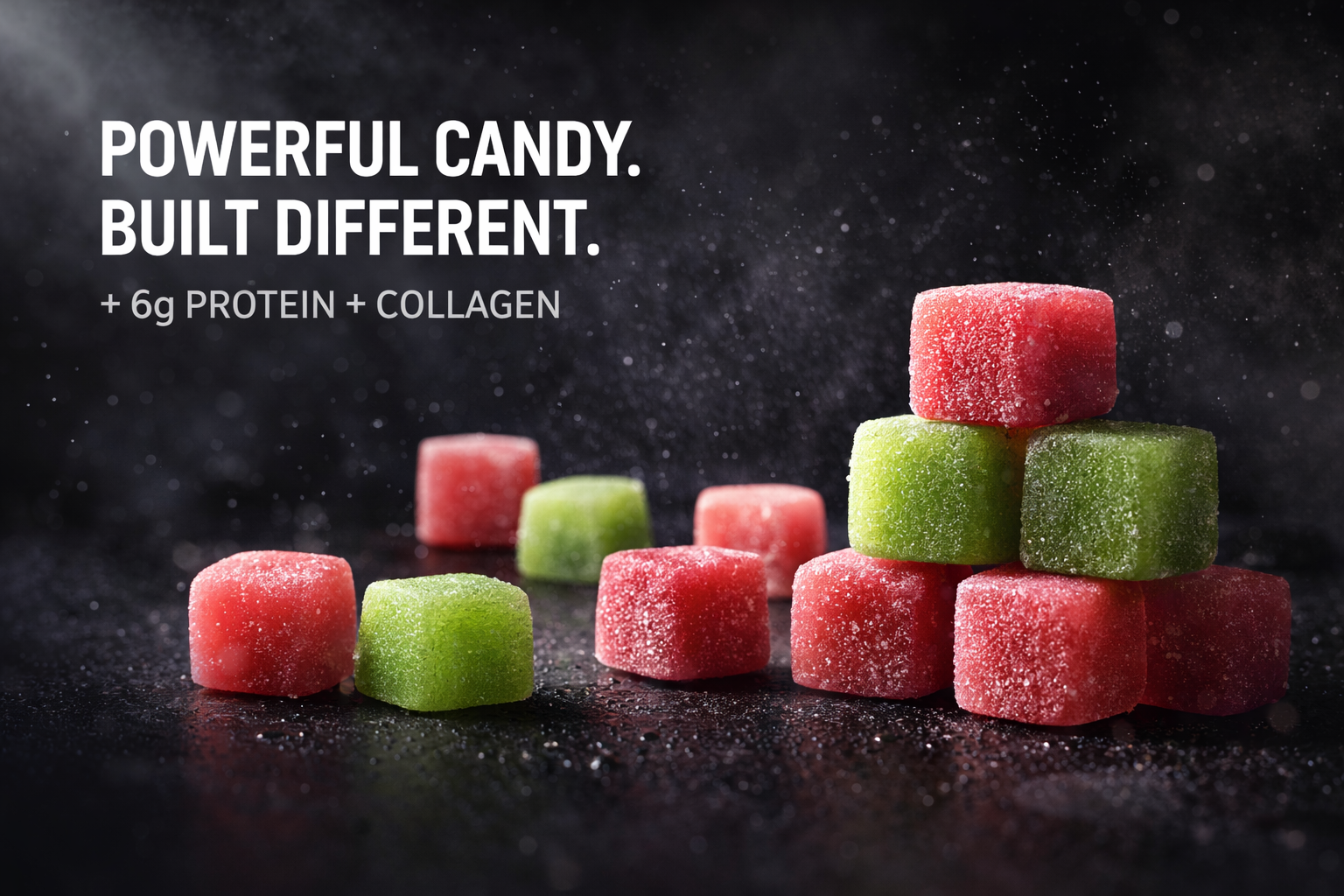 Each serving delivers 6g of protein + collagen in a soft cube gummy chew that tastes like real candy — not a supplement.